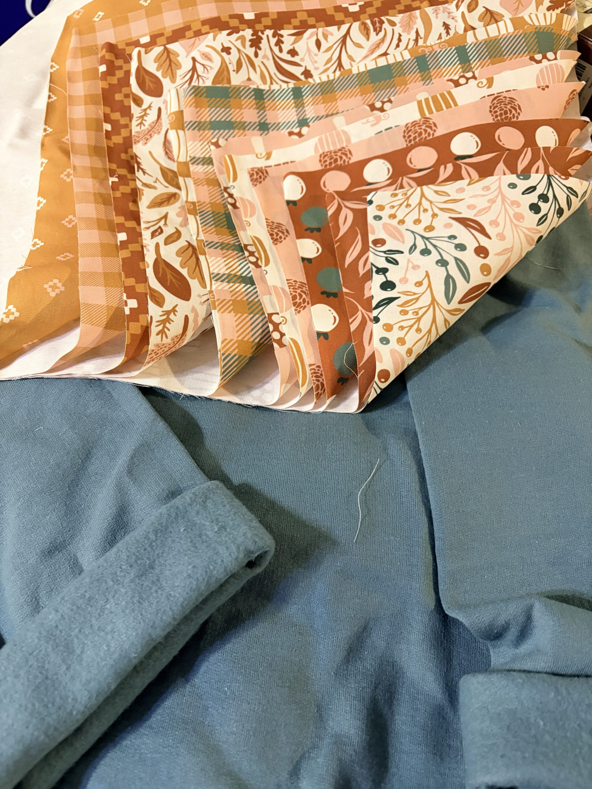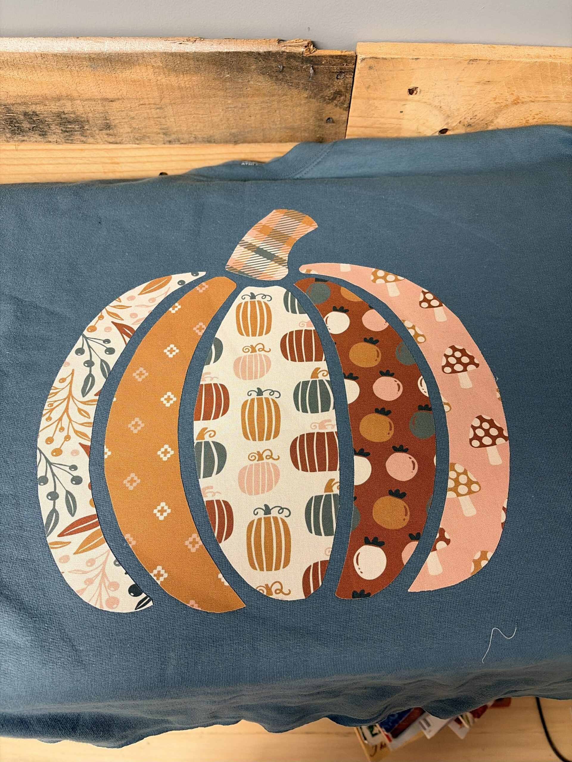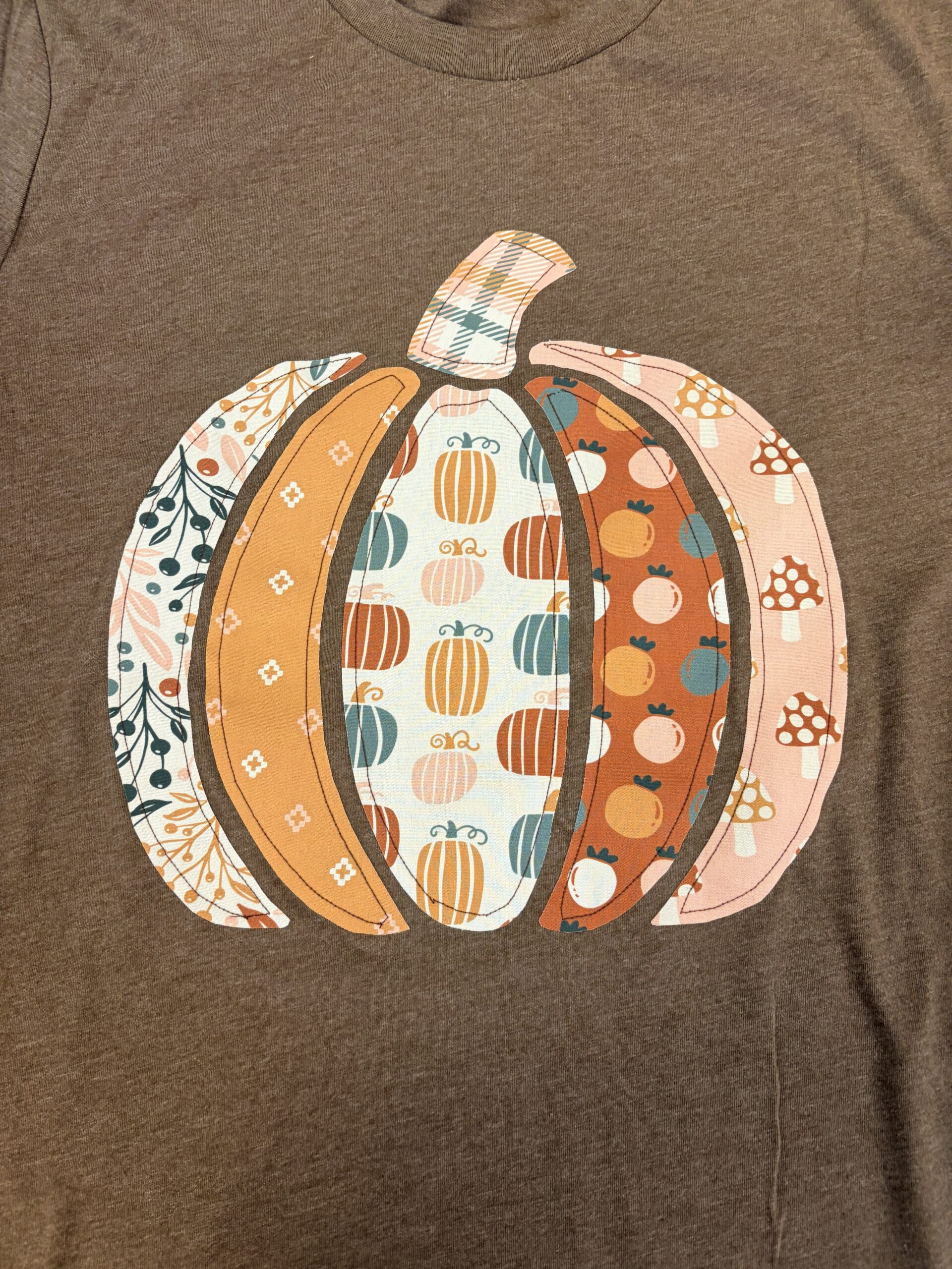 Each shirt features a beautifully detailed multi-fabric pumpkin design with a modern-vintage feel, blending florals, gingham, and autumn motifs. Available in rich brown or bluish-green, both are perfect fall tones that pair easily with jeans, leggings, or your favorite flannel.